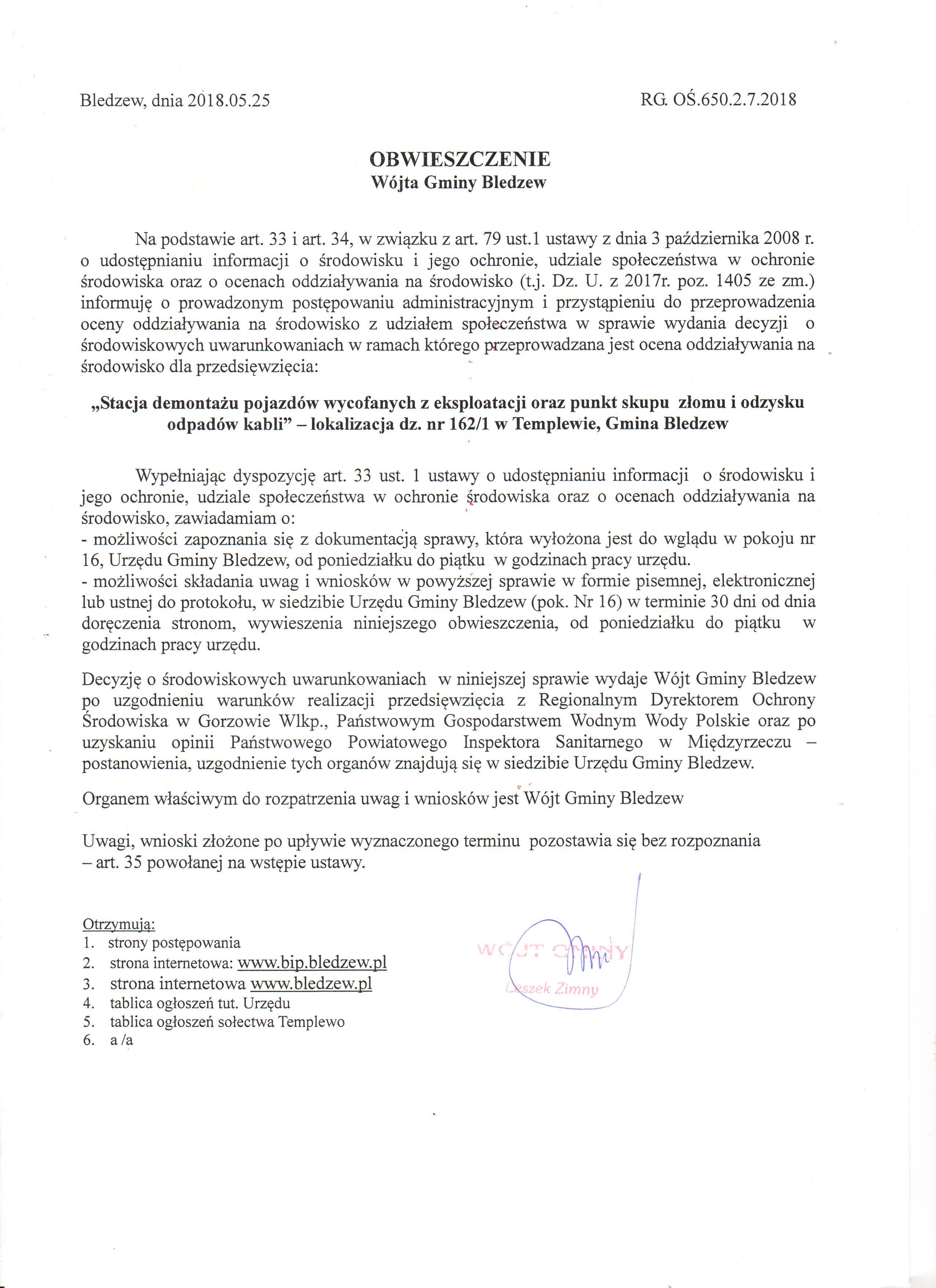 W załączeniu do pobrania Obwieszczenie znak RG.OŚ. 650.2.7.2018 z 25.05.2018 Wójta Gminy Bledzew