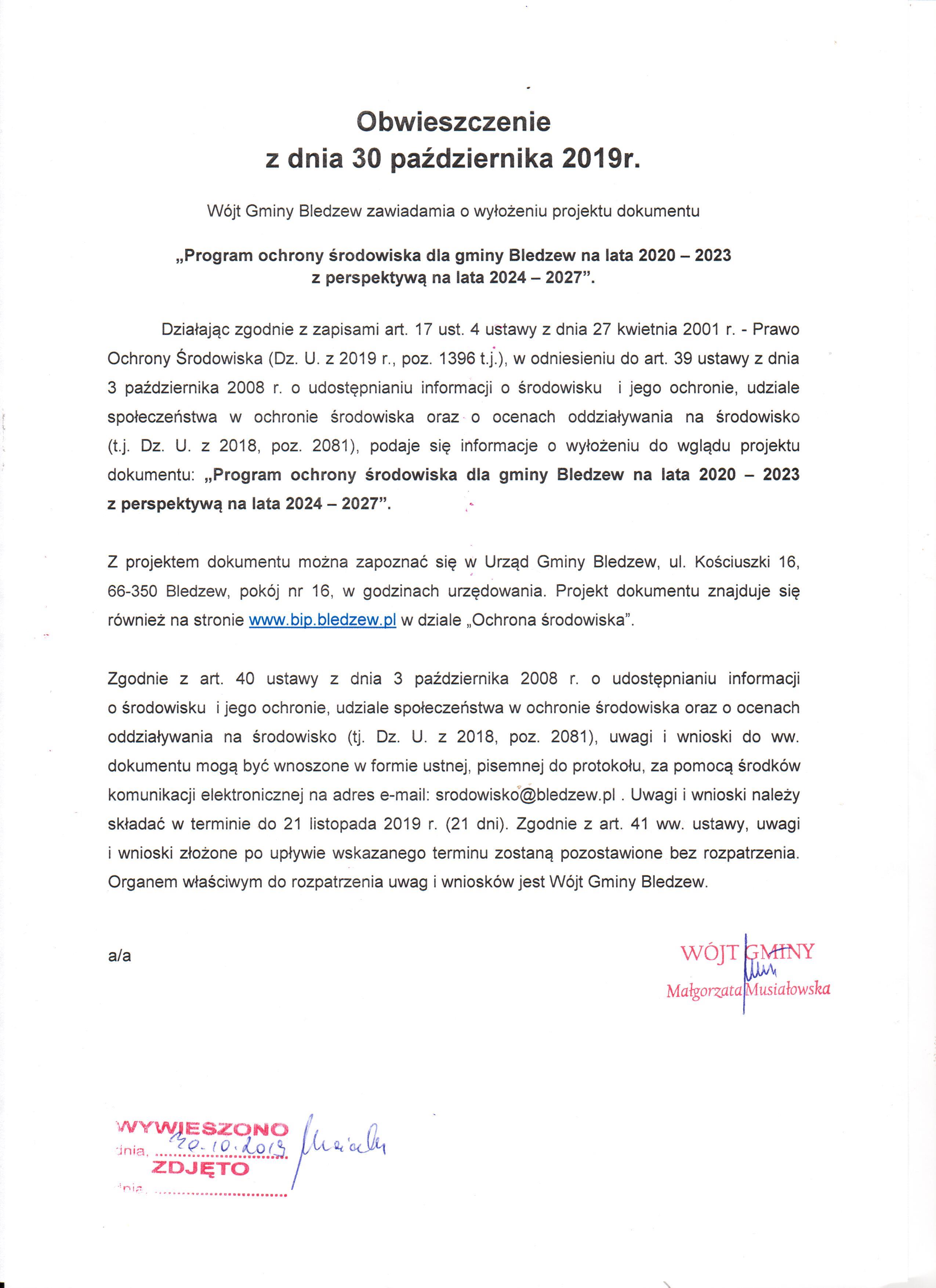 1. Obwieszcenie Wójta Gminy Bledzew - konsultacje dokumentu: „Program ochrony środowiska dla gminy Bledzew na lata 2020 – 2023 z perspektywą na lata 2024 – 2027”