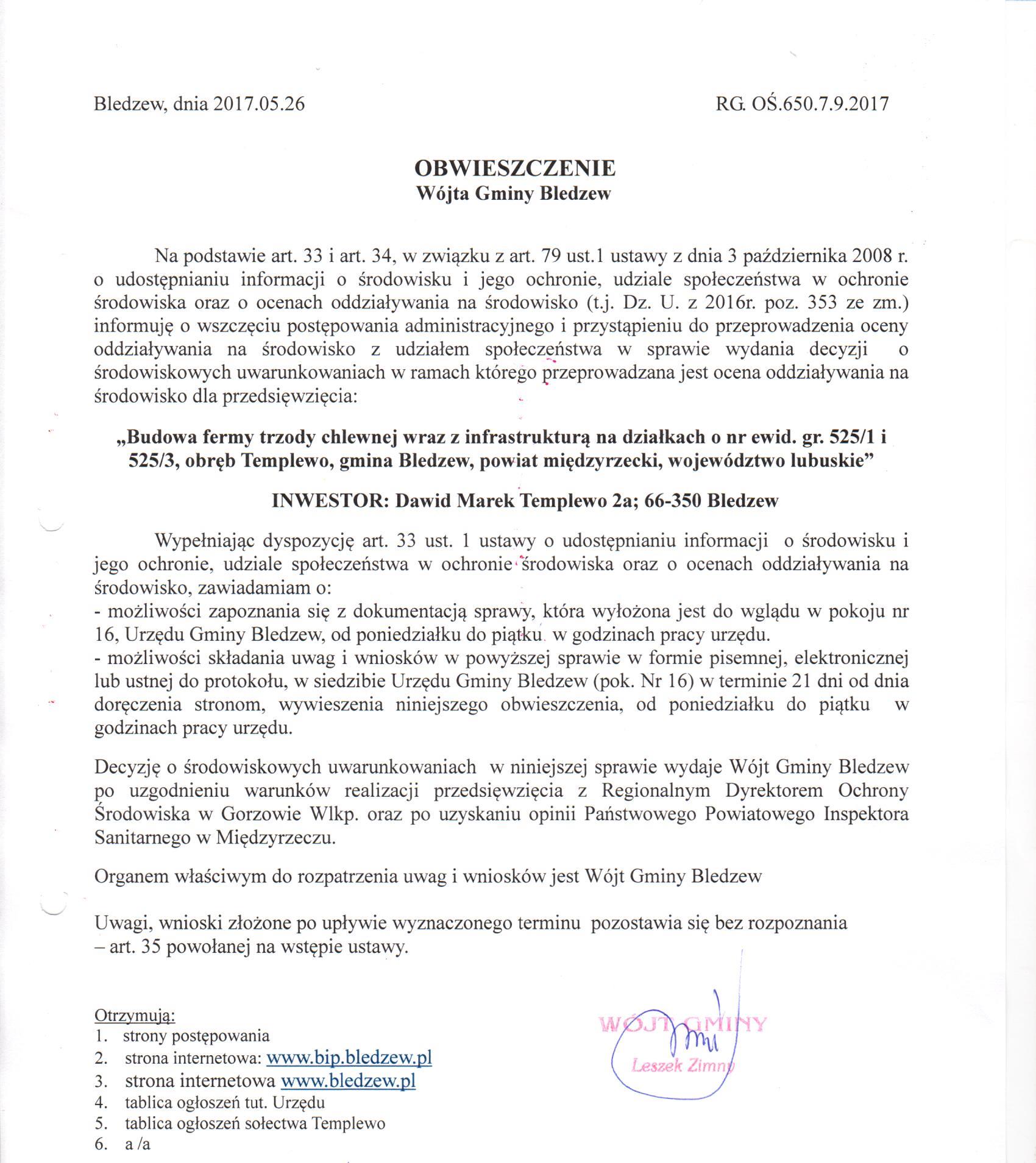 Do pobrania: Obwieszcenie Wójta Gminy Bledzew w sprawie przeprowadzenia oceny oddziaływania na środowisko z udziałem społeczeństwa w sprawie wydania decyzji o środowiskowych uwarunkowaniach w ramach którego przeprowadzana jest ocena odzdiaływania na środowisko dla przedsięwzięcia: " Budowa fermy trzody chlewnej wraz z infrastrukturą na działkach o nr ew. 525/1 i 525/3 w Templewie