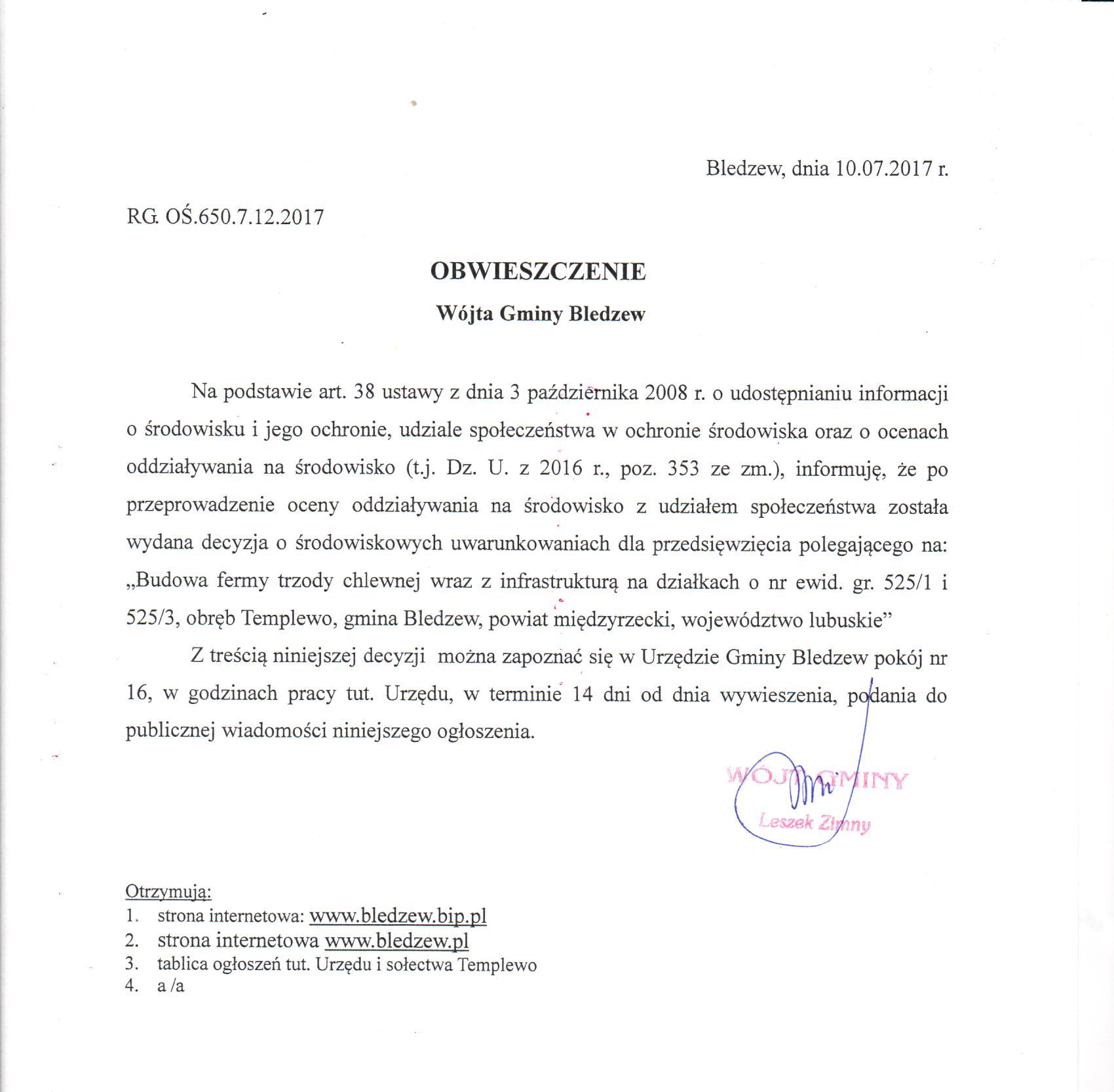 W załączeniu do pobrania Obwieszcenie Wójta Gminy Bledzew RG.OŚ. 650.7.12.2017r z dnia 10.07.2017r. o wydaniu decyzji o środowiskowych uwarunkowaniach