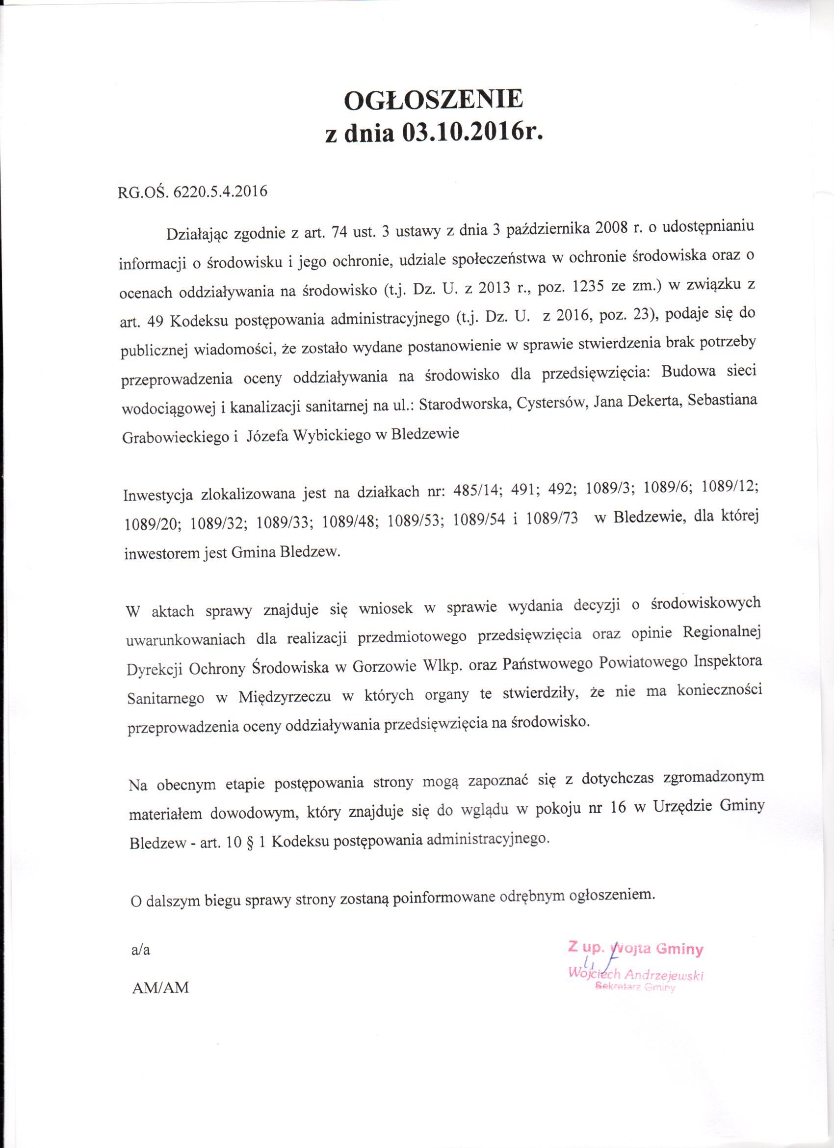 Do pobrania ogłoszenie o wydanym postanowieniu w sprawie stwierdzenia braku potrzeby przeprowadzenia oceny oddziaływania na środowisko dla przedsięwzięcia: Budowa sieci wodociągowej i kanalizacji sanitarnej na ul.: Starodworska, Cystersów, Jana Dekerta, Sebastiana Grabowieckiego i Józefa Wybickiego w Bledzewie.