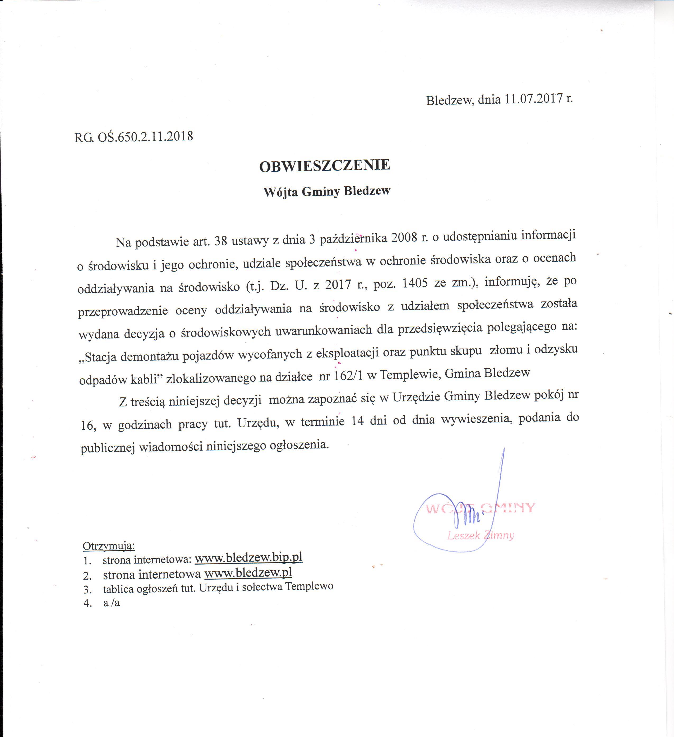 Do pobrania obwieszczenie z dnia 11.07.2018r. znak RG.OŚ. 650.2.11.2018 Wójta Gminy Bledzew o wydanej decyzji środowiskowej