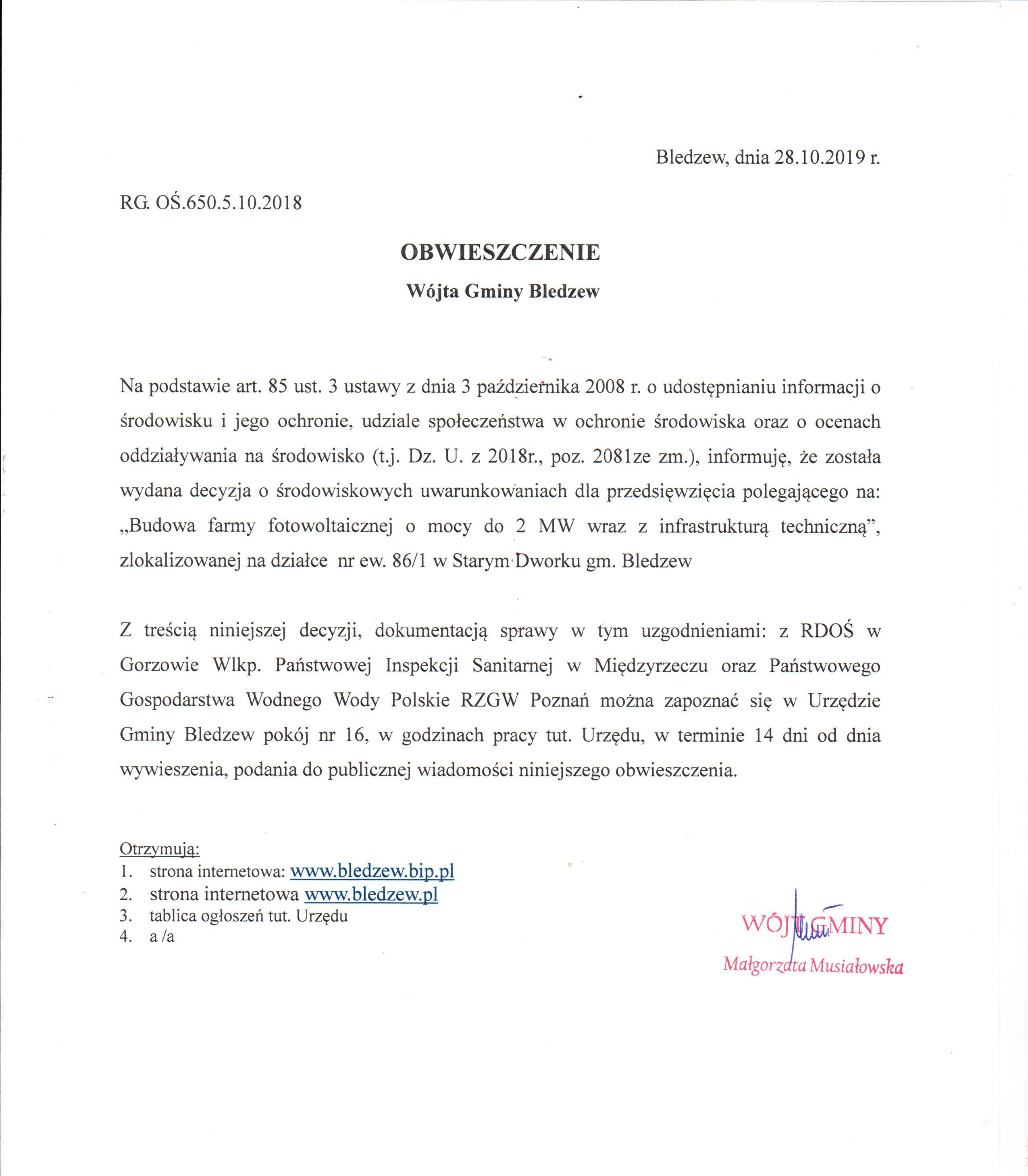Obwieszczenie Wójta Gminy Bledzew o wydanej decyzji środowiskowej