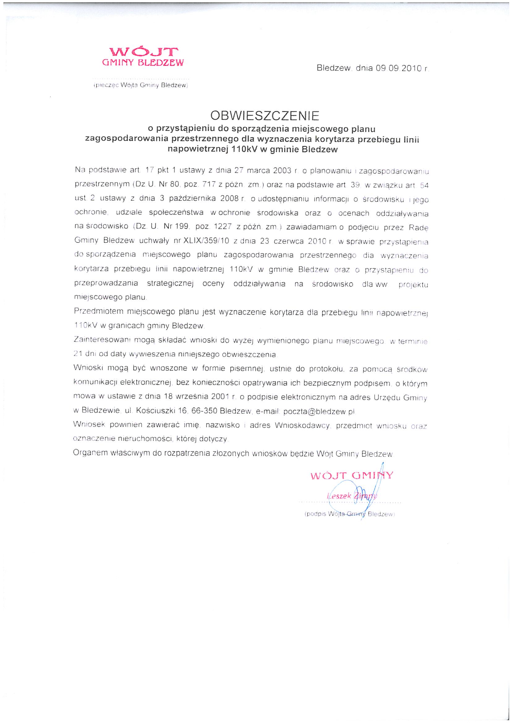 Na podstawie art. 17 pkt 1 ustawy z dnia 27 marca 2003 r. o planowaniu i zagospodarowaniu przestrzennym (Dz.U. Nr 80, poz. 717 z późn. zm.) oraz na podstawie art. 39, w związku art. 54 ust. 2 ustawy z dnia 3 października 2008 r. o udostępnianiu informacji o środowisku i jego ochronie, udziale społeczeństwa w ochronie środowiska oraz o ocenach oddziaływania na środowisko (Dz. U. Nr 199, poz. 1227 z późń. zm.) zawiadamiam o podjęciu przez Radę Gminy Bledzew uchwały nr XLIX/359/10 z dnia 23 czerwca 2010 r. w sprawie przystąpienia do sporządzenia miejscowego planu zagospodarowania przestrzennego dla wyznaczenia korytarza przebiegu linii napowietrznej 110kV w gminie Bledzew oraz o przystąpieniu do przeprowadzania strategicznej oceny oddziaływania na środowisko dla ww. projektu miejscowego planu.
