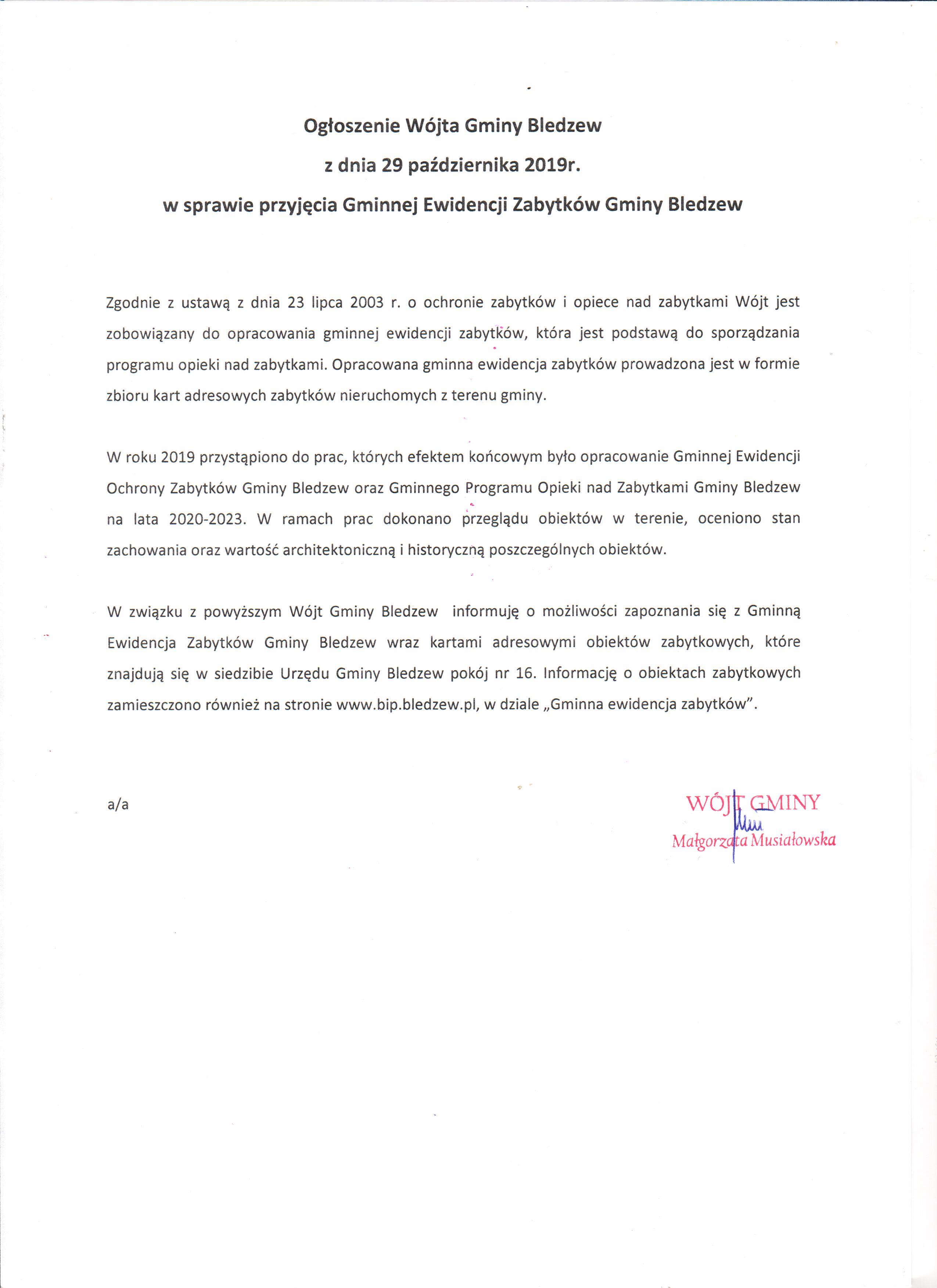 Ogłoszenie Wójta Gminy Bledzew z dnia 29 października 2019 r. w sprawie przyjęci...