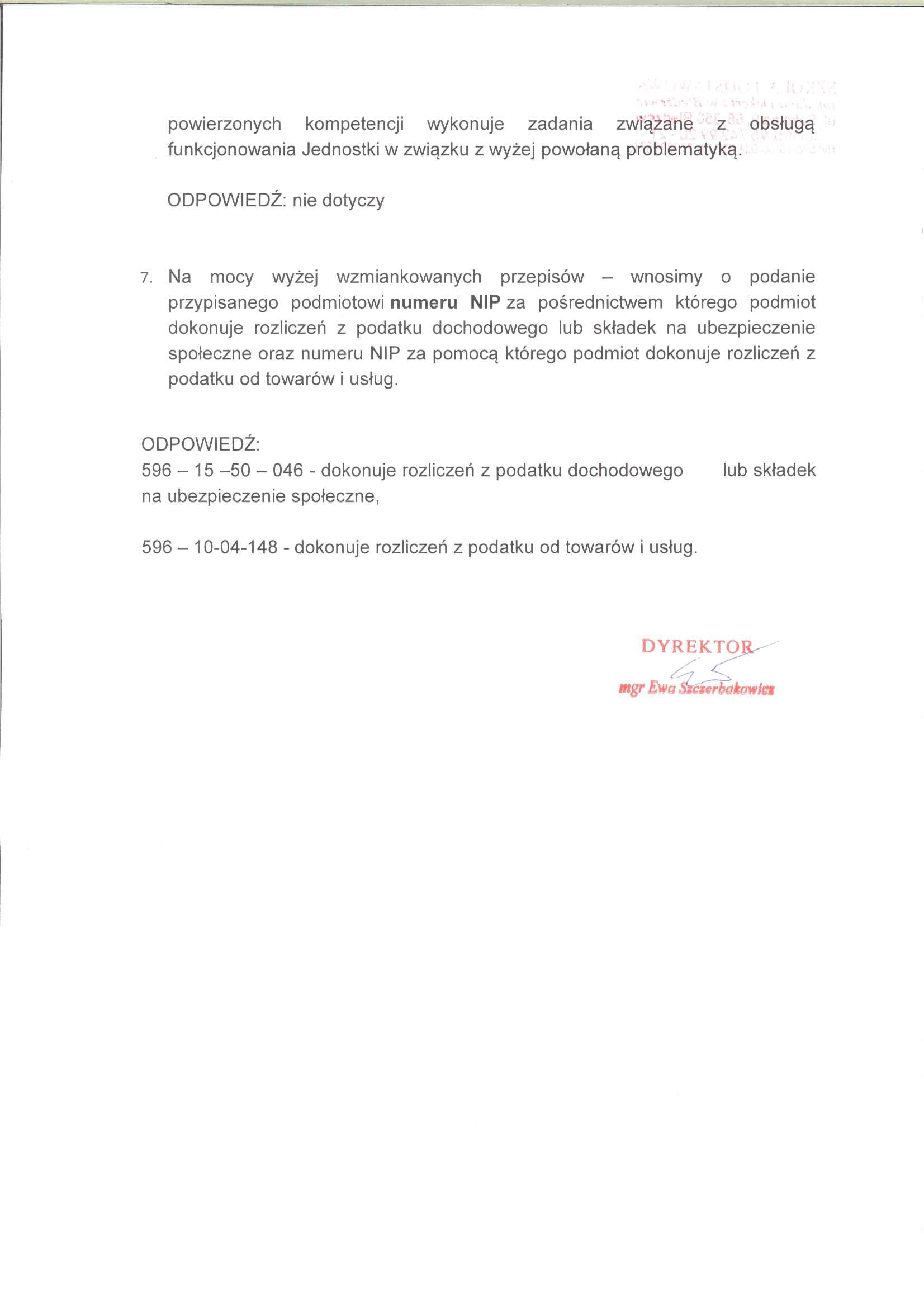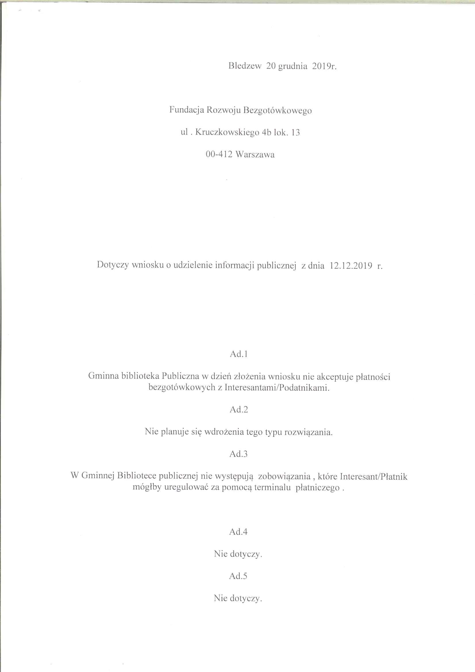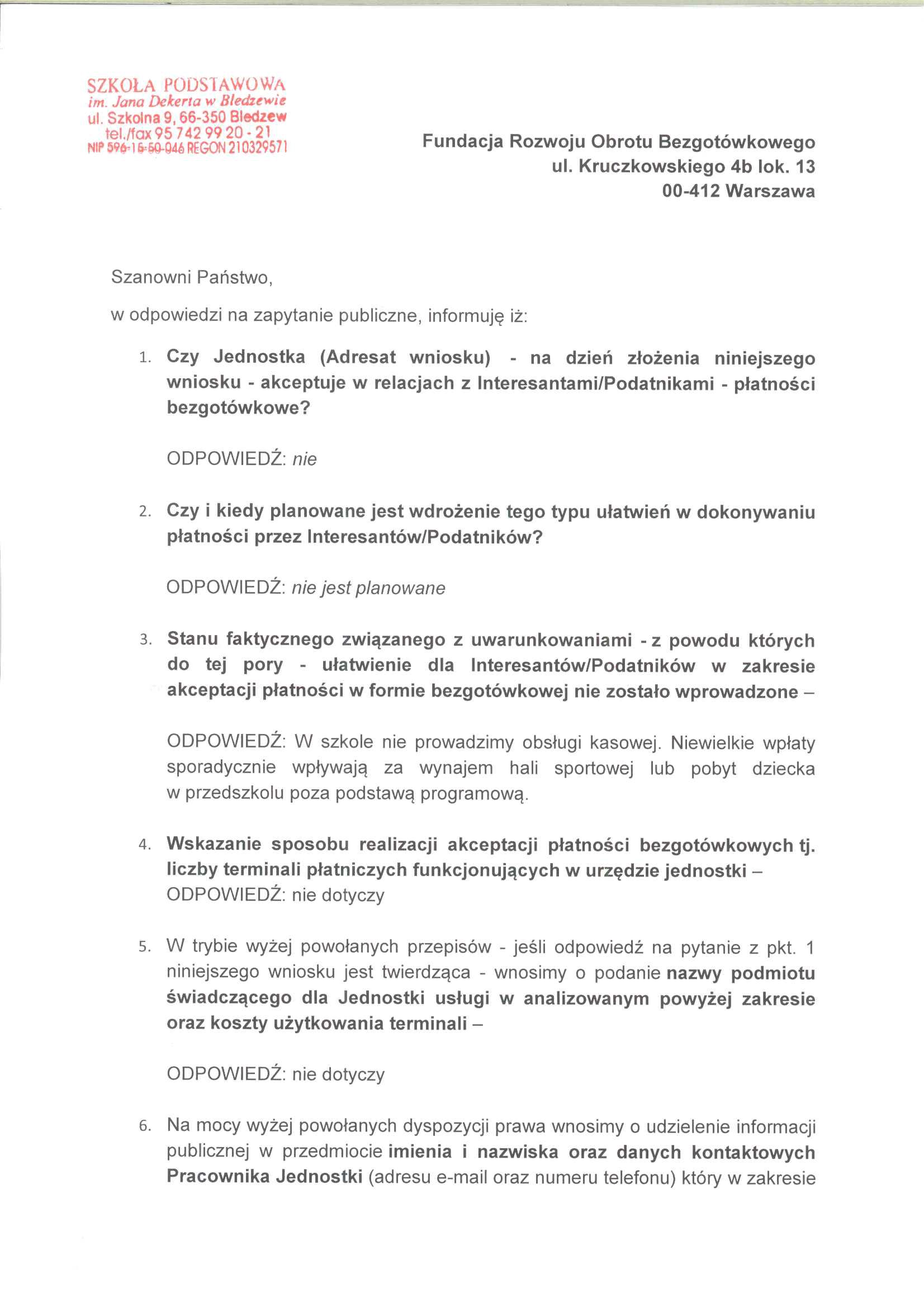 Odpowiedź na petycję udzielona przez SP Bledzew.